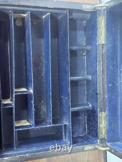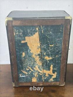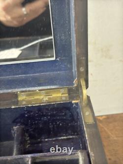 Here is a great old French box, probably late 1800s, overall its really not to bad, wonderful brass inlay, the medallion is liftining slightly, couple issues the key escutcheon is missing so they simply colored the area in gold! Some other minor loss, please look at all the photos, there is a removable tray, the compartment area, has some wear, very delicate as it was meant for jewelry or even sewing stuff.