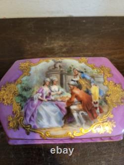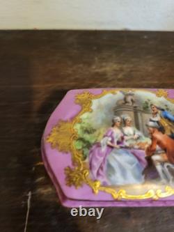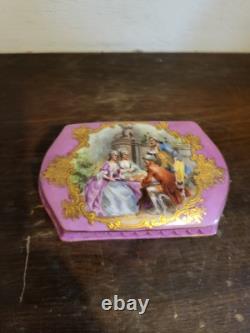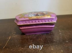 Antique French Sevres Style Porcelain Trinket Box Pink Courting Scene. Good condition, there are very minor traces of wear. Photos hopefully will give you the best idea of overall condition. Measures is 3 3/4" by 2 1/4" and 1 5/8 tall. If you any questions about this item please feel free to ask, good luck, and thanks for looking.