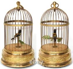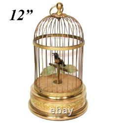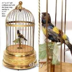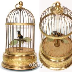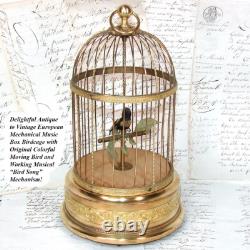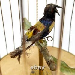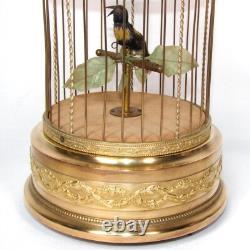 This one just in from France but I'm not seeing any markings on it so hard to say just where and when it came from. We've had the pleasure to offer a few of these over the years, this one not quite as fantastic as some but quite nice in that it's working and with little to no damage to note. A colorful little bird, perched inside and swivels its head and bats its tail feathers as the whistling song plays. See video, not quite a melody but just as charming as can be. I see no damage to the cage framework or base, the bird's feathers are a bit tattered and we're not sure if the leaves inside are original or a later addition/replacement.