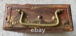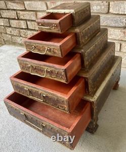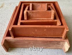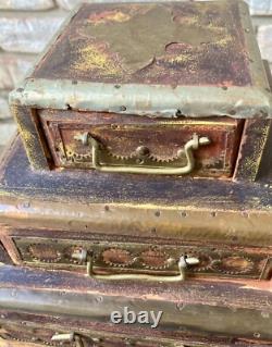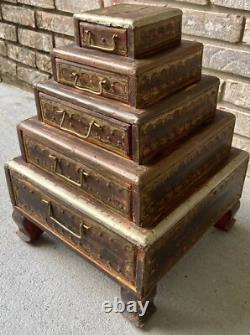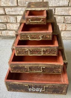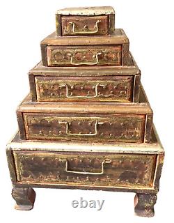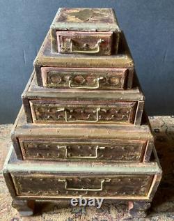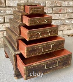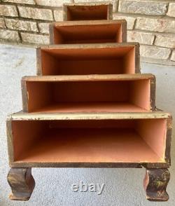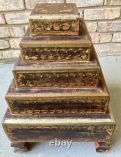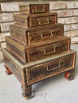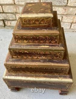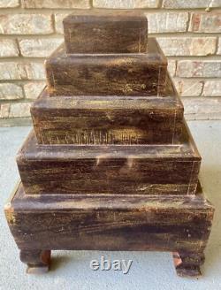 Wonderful stacked 5 drawered tiered box. It measures 17 inches in height and is 12 inches by 12 inches on the largest tier. The smallest top box measures 4.5 inches by 4.5 inches.