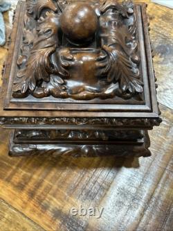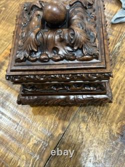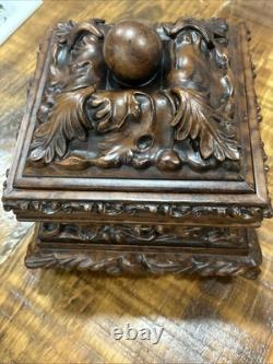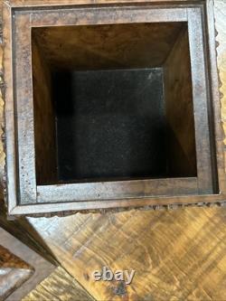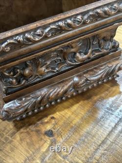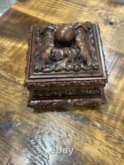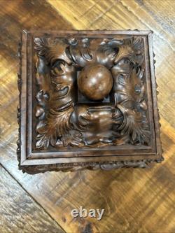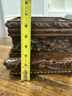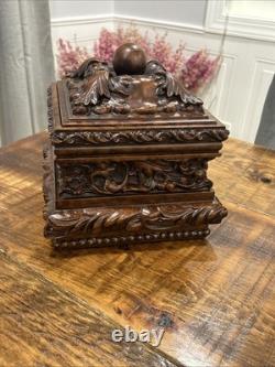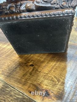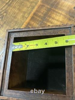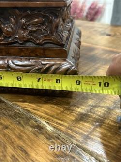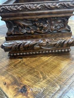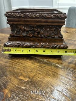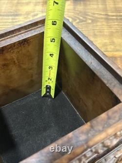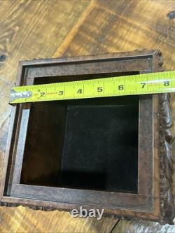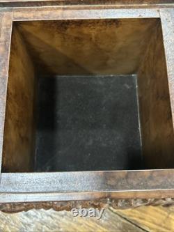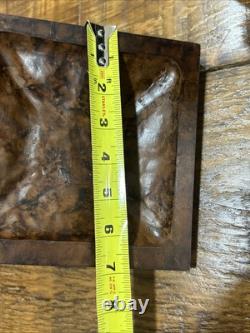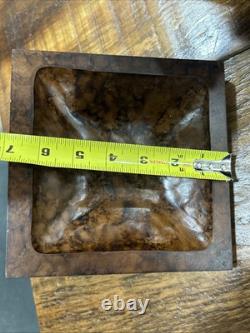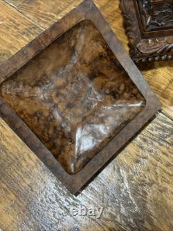 This trinket box is a beautiful vintage piece in ornate condition, with a square shape measuring 9 inches on each side. It is possibly made of resin, giving it a unique and intricate appearance. The box features a brown color and comes boxed for safekeeping.