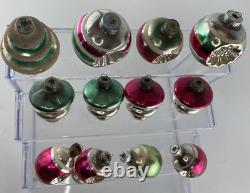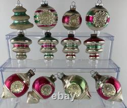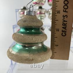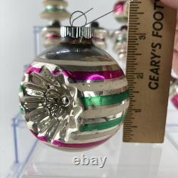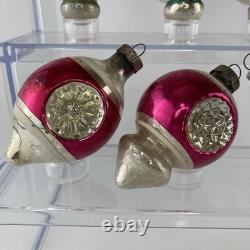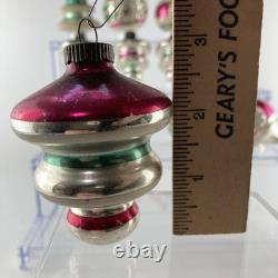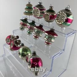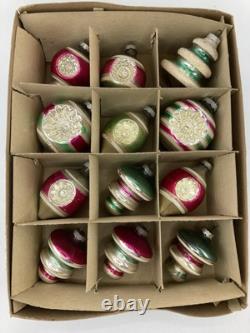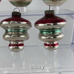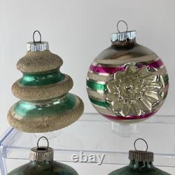 There are UFO ornaments, The largest with the green stripes has mica glitter. There are round balls and teardrop ornaments with double indents. All with some sort of stripe design. Nice preowned and used condition. Please refer to all photos and video for best description.We are not antique dealers, collectors or experts. We describe the item along with any flaws and markings we can find the best we can.