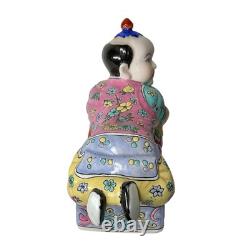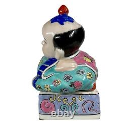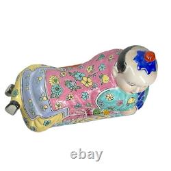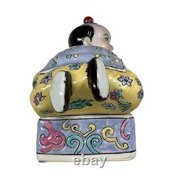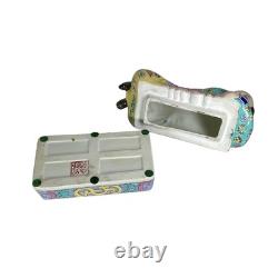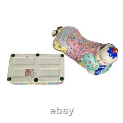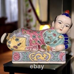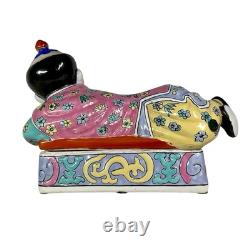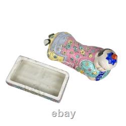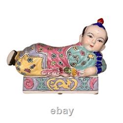 This vintage porcelain ceramic figurine box is a stunning piece with a chinoiserie pattern and a multicolor finish. The box features a Chinese boy lying down and his clothes are adorned with a floral pattern. It measures 7 inches tall, 11 inches in length and 5 inches in width, making it a perfect size for any room. The box is lidded and has a glazed finish, adding to its unique beauty.