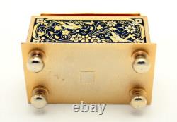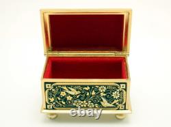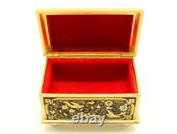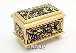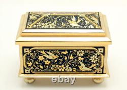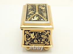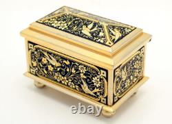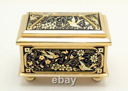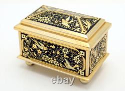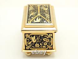V INTAGE DAMASCENE GOLD DOVE & FLOWERS FOOTED TRINKET / JEWELRY BOX TOLEDO SPAIN. This listing is a rectangular trinket or jewelry box with gold damascene design featuring birds in flight and floral design with lots of foliage from Toledo, Spain. Please see photos below for more details. Measurements: The box measures approximately 67.5 mm x 49 mm x 43 mm.