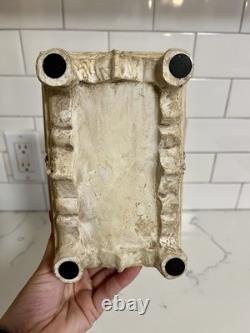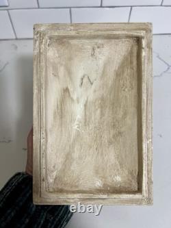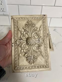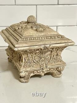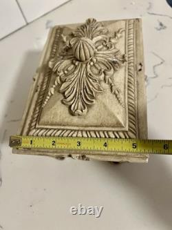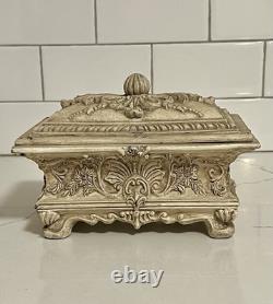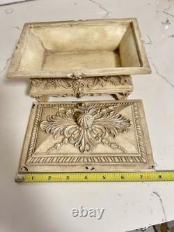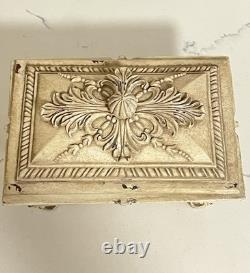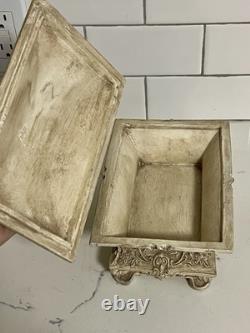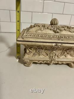 This vintage jewelry box is the perfect addition to any collection. The beautiful cream color and intricate carvings make it a stunning display piece. The box is handmade and footed, adding to its unique charm. It is perfect for storing precious trinkets and jewelry. The box's country/region of manufacture is unknown, adding to its mystery and allure.