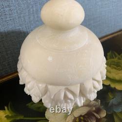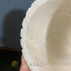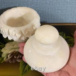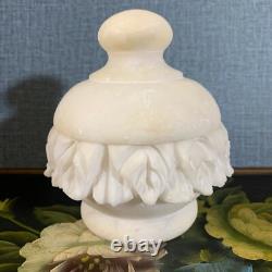 Its light, neutral ivory hue lends an air of sophistication, while the lidded top offers practicality for storing cherished items. Elegant and timeless Scuffs and scratches inside the jar, not affecting overall beauty. Flea bites on the inner rim. Small blemishes on the exterior, none larger than the point of a marker, but no chips or cracks, as alabaster has a tendency to age with time and use.