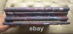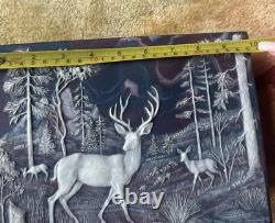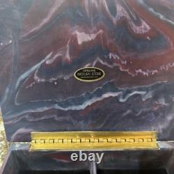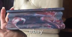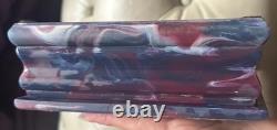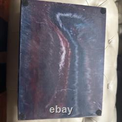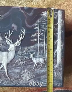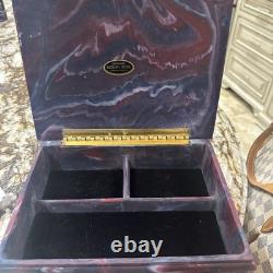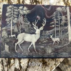 The Vintage Incolay Stone Jewelry Box with a Deer Forest pattern is a handmade, original piece crafted in the United States by M. This rectangular jewelry box features a blue and purple stone material with a subject of a deer, making it suitable for any room and all occasions. Care instructions recommend cleaning with a damp cloth.