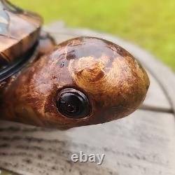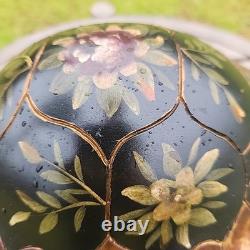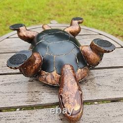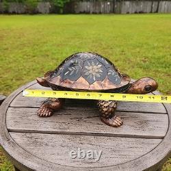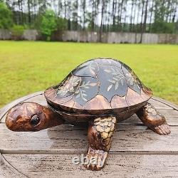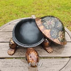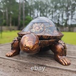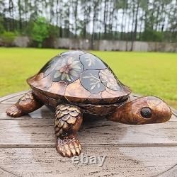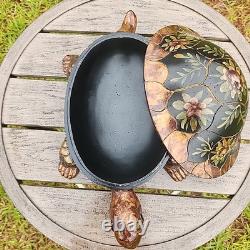 This vintage trinket box features a beautifully hand-painted turtle design on a multicolored oval shape. The large size of the box makes it suitable for furniture and any room.