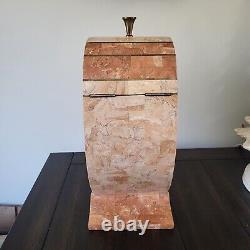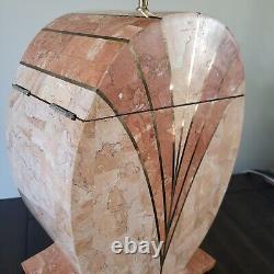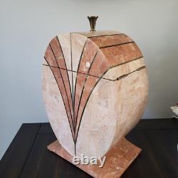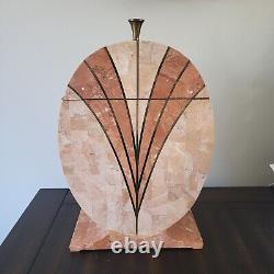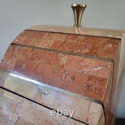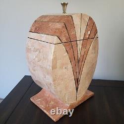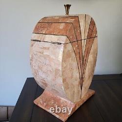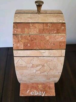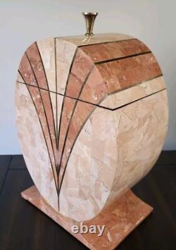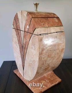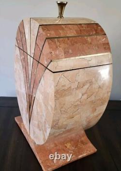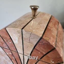 This vintage Maitland Smith box features a marbled pink design with an art deco-inspired style. The oval-shaped box is made of marble with brass inlay details, suitable for holding bottles or knick-knacks.