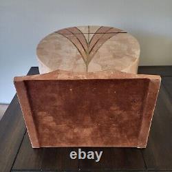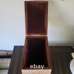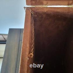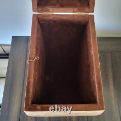 Measuring 6 1/2 inches in length, 9 1/4 inches in width, and 15 inches in height, this large keepsake box from the 1980s exudes a sophisticated and elegant aesthetic, perfect for any room in the home. It is lined and has a chain inside that is not operative, the box is in very good condition, the lining inside looks great.