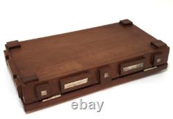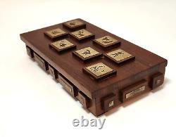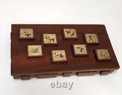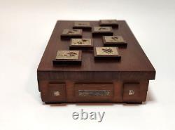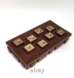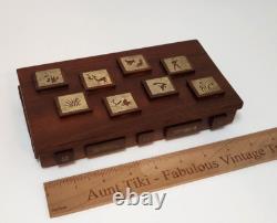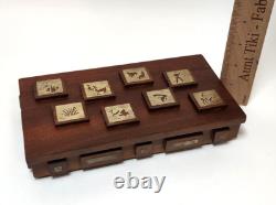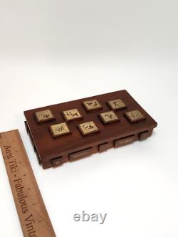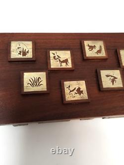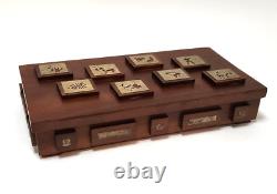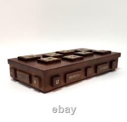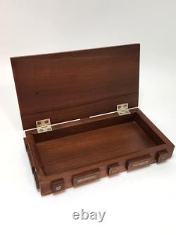 This unique box is perfect for stashing small trinkets or jewelry. Slim enough to tuck into a drawer but beautiful enough to be an interesting piece of showcased decor. Measurements - 8.25" Length x 4.75" Width x 2 Height (including raised wood squares) Inside Measurements. Length x 3.25 Width x. Good condition but may exhibit some wear due to age.