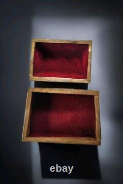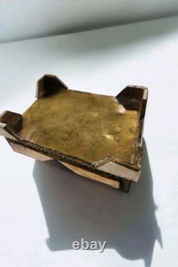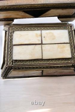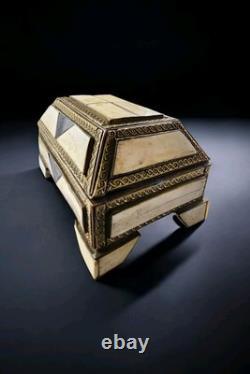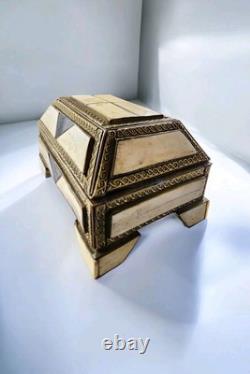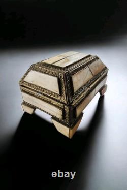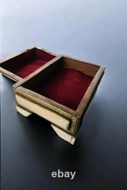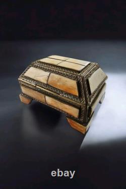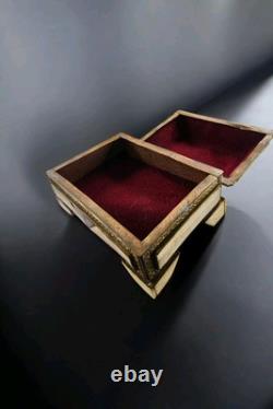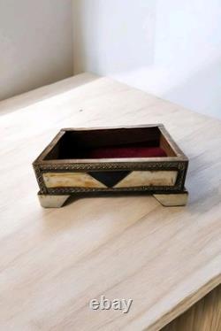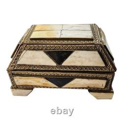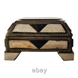 Delve into the exotic charm of this Vintage Moroccan Camel Bone & Brass Inlaid Trinket Jewelry Box, a treasure that exudes antique allure with its intricate multicolor design. The small, rectangular shape, measuring 5.5 inches in length and 3.5 inches in height and width, is meticulously crafted with a rich blend of bone and brass materials, reflecting the meticulous artisanship synonymous with Moroccan keepsakes. Lined with soft red felt, this jewelry box serves as a safeguard for your precious items, ensuring they are cradled in comfort. Its antique finish and Moroccan heritage infuse it with an aura of bygone elegance, making it not just a container but a piece of history to cherish.