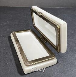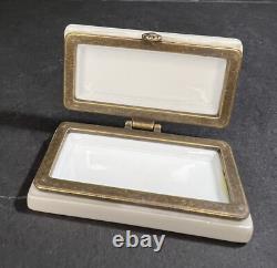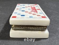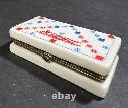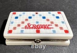 This vintage trinket box is a must-have for any board game enthusiasts. Made by Midwest of Cannon Falls in 1999, this porcelain box features a glossy finish and multicolor design representing the Scrabble board game by Hasbro. Perfect for storing small items, this rectangle-shaped box is branded with the iconic Scrabble logo and is sure to be a conversation starter on any shelf or tabletop. The box is in excellent shape, with no visible defects or flaws. Measures approximately 2.5"x1.25" with no trinket inside.