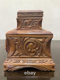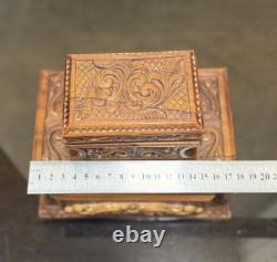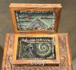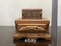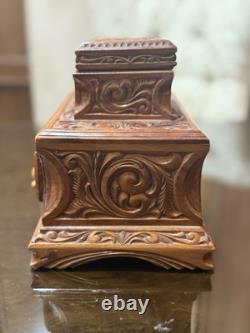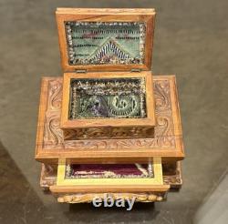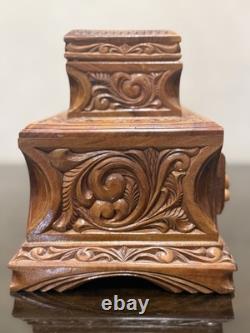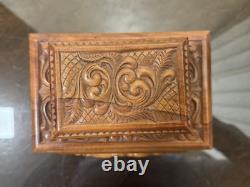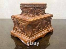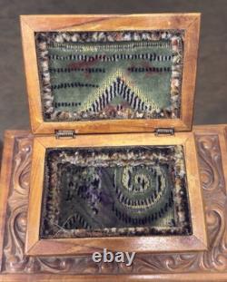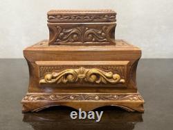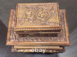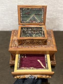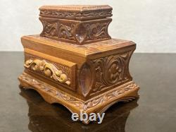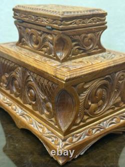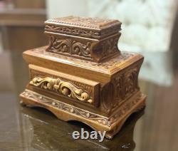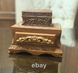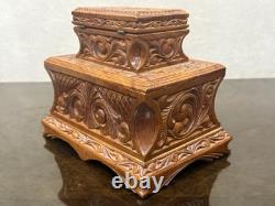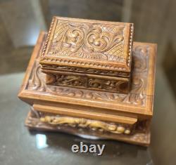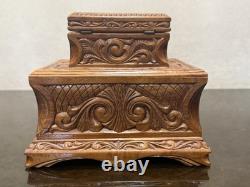 Vintage Soviet Era Wooden Jewelry Box. For sale is a unique wooden jewelry box from the Soviet Union, crafted during the 1960s-1970s. This piece exemplifies exquisite handiwork with intricate carved ornamental and floral patterns, showcasing the high skill of its creator. The box was made in a prison workshop (known as "Zekprom"), adding significant historical and cultural value. It features a two-tier design: a top compartment with a hinged lid and a lower drawer, both adorned with detailed carvings.