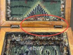 Crafted from high-quality wood with a warm, rich finish that highlights the natural texture of the material. The top compartment has a lid with simple metal barrel hinges, revealing an interior lined with fabric featuring a geometric pattern (green background with triangles and stripes). The lower drawer slides out and is lined with red fabric showing slight wear, adding to the item's authenticity. The carvings include complex spiral and floral motifs that decorate all visible surfaces, including the legs and edges. Signs of age are evident inside: the fabric is worn in places with frayed edges and some dust accumulation, and there is a small crack in the wood near the hinge of the top compartment (approximately 5-7 cm horizontally), indicating natural wear from frequent opening or changes in storage conditions. This item is in used condition with typical age-related imperfections. The most noticeable issue is a crack in the wood near the hinge of the top compartment, which does not affect functionality but may worsen over time. The interior fabric is worn, with torn edges and slight dust buildup, which is common for items of this age. Despite this, the aesthetic appeal and functionality remain intact. Made in a Soviet prison workshop (Zekprom), this box is a rare artifact reflecting craftsmanship under unique conditions. It is particularly valuable for collectors of Soviet history, vintage enthusiasts, or those interested in decorative items.Ideal for collectors, decorators, or anyone interested in unique historical artifacts. If needed, the crack can be stabilized with wood glue and clamps, but for a flawless repair, consulting a professional restorer is recommended.