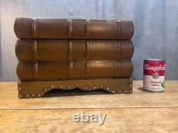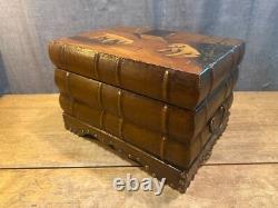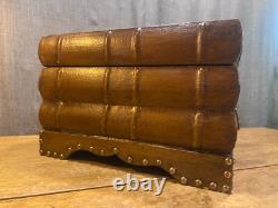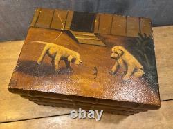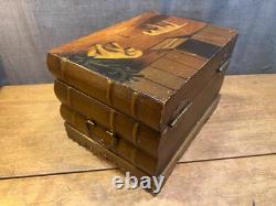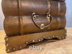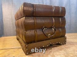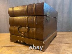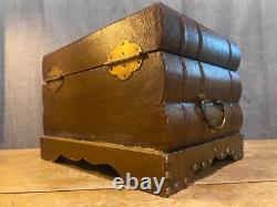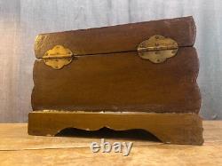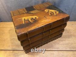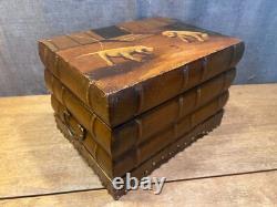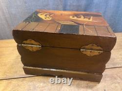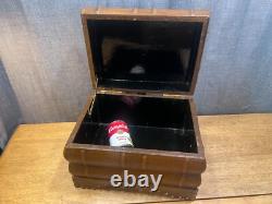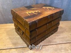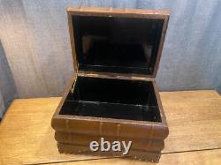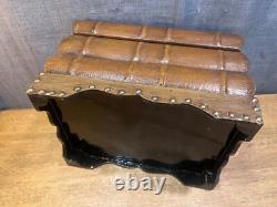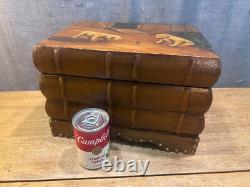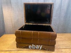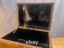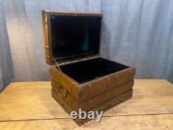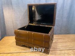 This box measures 13" wide x 8 1/2" tall x 9 3/4 deep. It appears to be wood lacquer and is coated on the outside with leather or something similar. Please see the pictures for the best description and if you have any questions please ask.