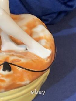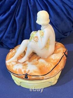 Vintage Art Deco German Porcelain Lady Bathing Beauty Trinket Powder Box. Has some numbers on her but I don't know the brand. It looks like maybe her neck was repaired but it's very hard to see under her necklace. Please review all pictures as they are a part of my description. Has some scuffs on the bottom.