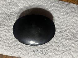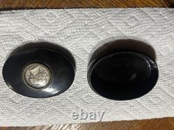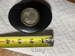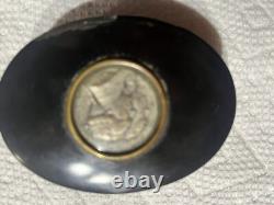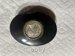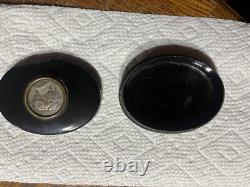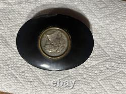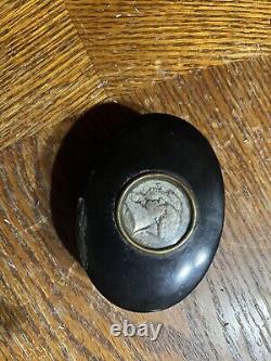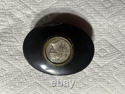 This is an approximately late 1800's commemorative George Washington and Marquis Lafayette French oval snuff box. This snuff box contains a coin on the lid with a profile of Washington and Lafayette.